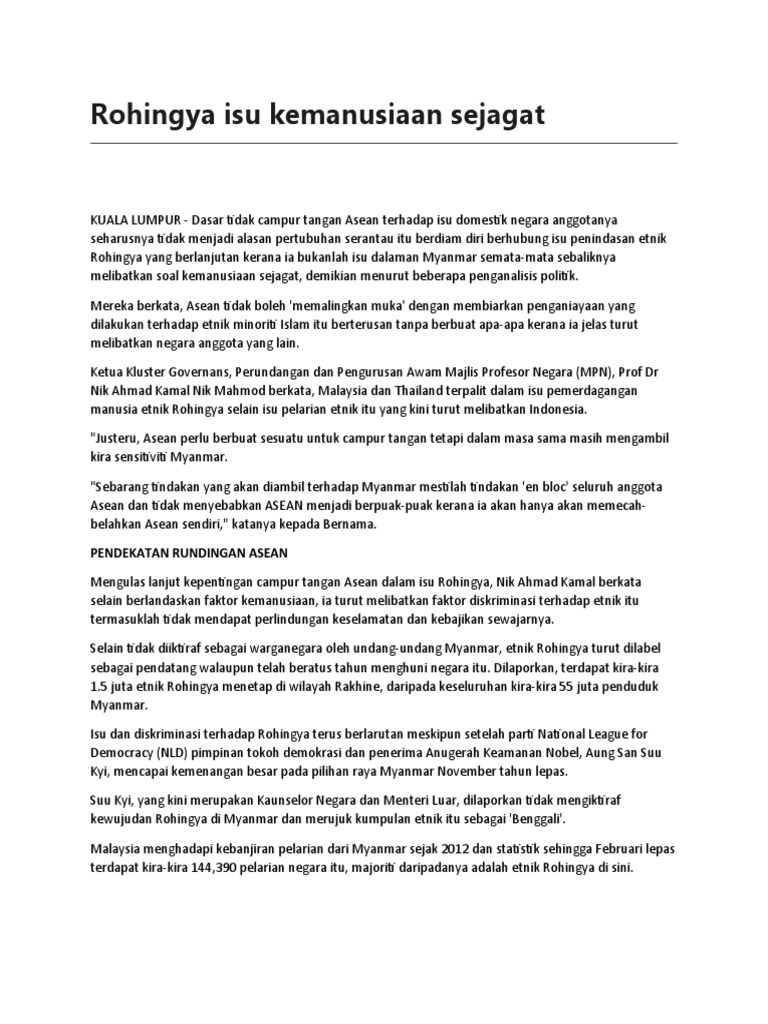 Antara negara yang menjadi persinggahan dan tempat berteduh bagi masyarakat rohingya termasuk malaysia. Etnik rohingya sudah lama teraniaya. Penindasan ke atas etnik rohingya di wilayah rakhine, barat myanmar membuktikan keganasan bukan hanya dikaitkan dengan islam, sebaliknya mereka yang menggunakan agama untuk bertelingkah. Menyumbang kekangan pelaksanaan polisi berasaskan citra kekejaman myanmar terhadap etnik rohingya: Pbb menyebut rohingya sebagai etnis minoritas paling teraniaya sejagat. Populasi etnis rohingya di myanmar, yang sebetulnya negara mayoritas buddha, mencapai angka satu juta orang. Lmck 1621 etika & profesionalpenindasan terhadap etnik rohingya nama pensyarah dr. Yang terjadi adalah penindasan terhadap kaum muslimin yang terus berlanjut. Ini antara maklumat yang kami dapat tentang siapa orang rohingya dan kenapa mereka ni dinafikan hak mereka. Documents similar to penindasan dan pencabulan hak asasi etnik rohingya. Etnik rohingya selama ni dianggap sebagai kumpulan minoriti paling ditindas di dunia. Presiden thein sein menolak bahawa rohingya, dengan populasi sebanyak 800,000 orang, adalah satu kumpulan etnik, dan memanggil mereka. Dia merupakan harapan terakhir kami tetapi dia mengendahkan rayuan kami dan menyokong genosid etnik rohingya.