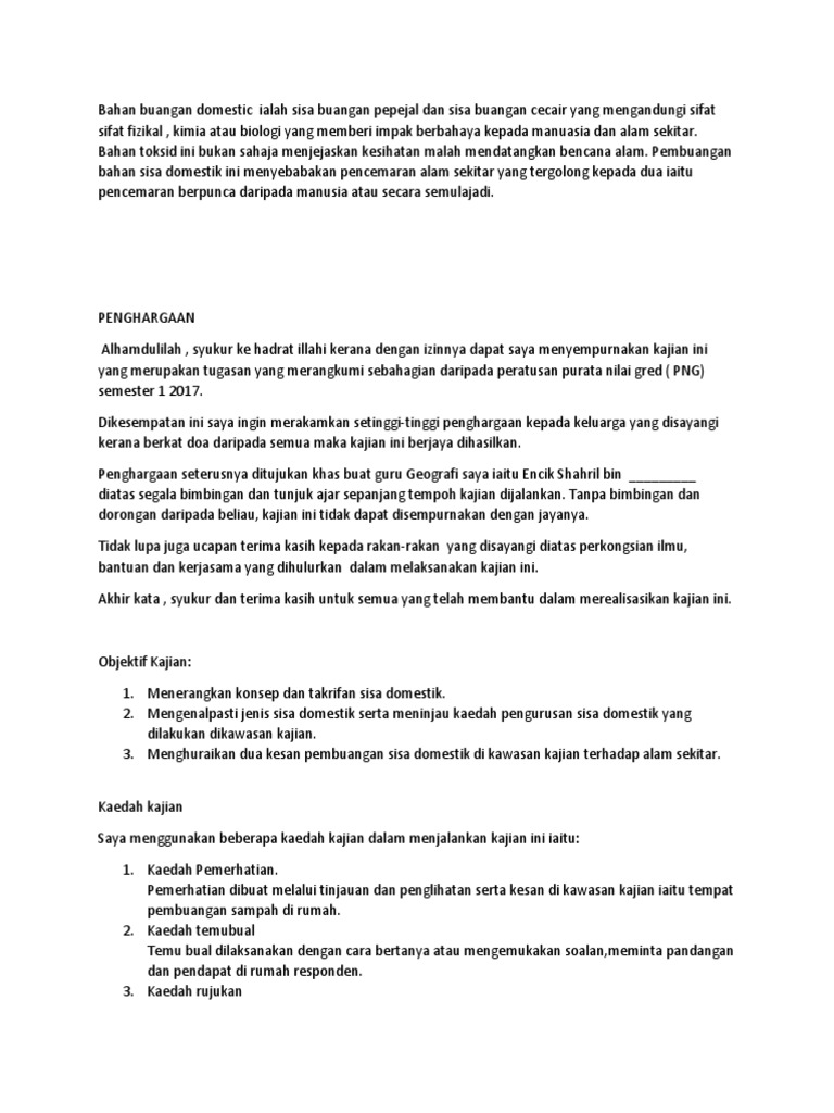 SISA DOMESTIK.docx - SISA DOMESTIK NAMA TINGKATAN MARKAH ... from www.coursehero.com Cari 1 tesis yang berkenaan (master @ phd) 4. (2) membantu usaha pemerkasaan pendidikan tahfiz yang dihasratkan oleh pihak kerajaan malaysia. Pemetaan objektif, sorotan literatur dan metod kajian (dr zam). 1.mengenalpasti punca perpecahan kaum yang berlaku. Melibatkan penulisan objektif kajian, pendahuluan dan penghargaan. Sisa domestik docx sisa domestik nama tingkatan markah senarai kandungan bil kandungan 1 penghargaan 2 pendahuluan 3 objektif kajian 4 kawasan kajian. Tempoh masa yang diberi untuk menyiapkan kajian ini ialah 5 minggu. Domestika is the largest community for creatives.