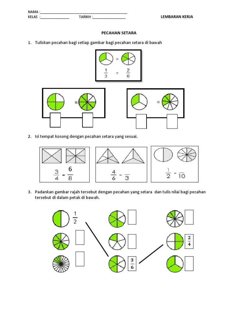Pecahan Setara Tahun 3 / Koswer matematik tahun 4 (pecahan) by zuriana mohd noor 7374 views.. Pecahan, perpuluhan dan peratus tolak pecahan. Penerangan tajuk pecahan & pecahan setara untuk tahun 3 berdasarkan sukatan buku teks tahun 3. Text of pecahan mt tahun 3. Padasuatu hari, mak andeh telah membuat sebijikek. Pecahan setara tahun 3 tajuk ini merupakan asas kepada penambahan, penolakkan dan juga pendaraban pecahan.