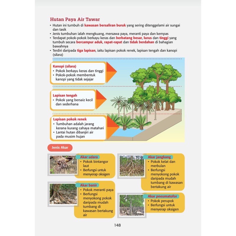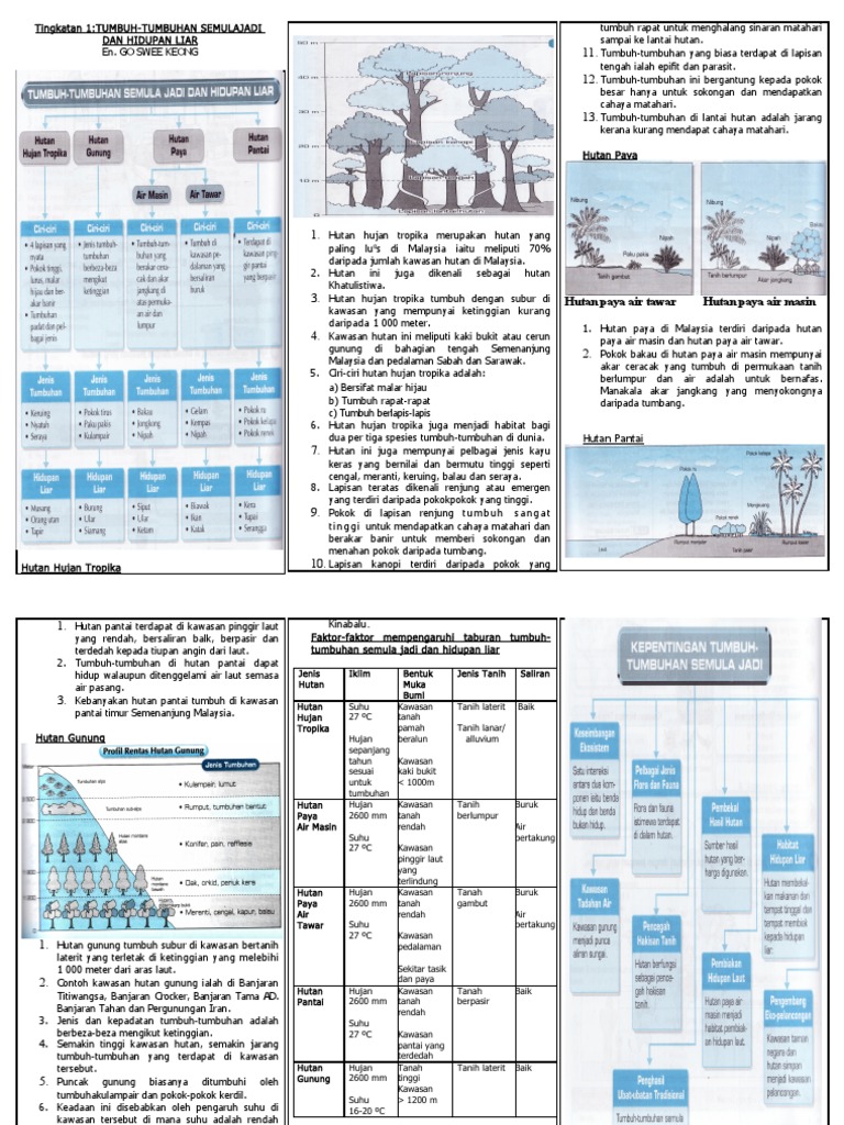 • terdapat pelbagai spesies tumbuh bercampur aduk seperti ramin, kompas, rumbia, bintagor, gelam, jongkong, semayur, palma, nipah, meranti paya. Geografi tingkatan 3 bab 4. Hutan pelajaran ini dibahagikan kepada zon yang berdasarkan spesis dominannya iaitu nipah, putat, jejawi dan malabera. Hutan hujan tropika, hutan paya air tawar, hutan paya air masin, hutan gunung,hutan pantai. Terdapat kawasan paya yang ditebus guna menjadi kawasan pertanian seperti: